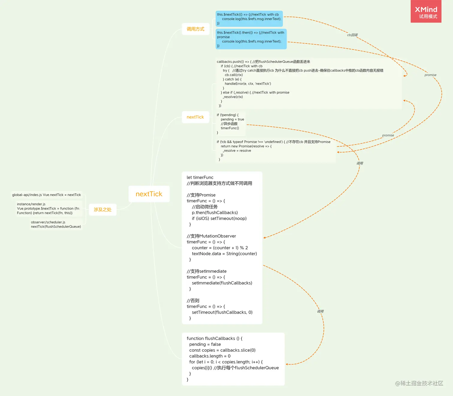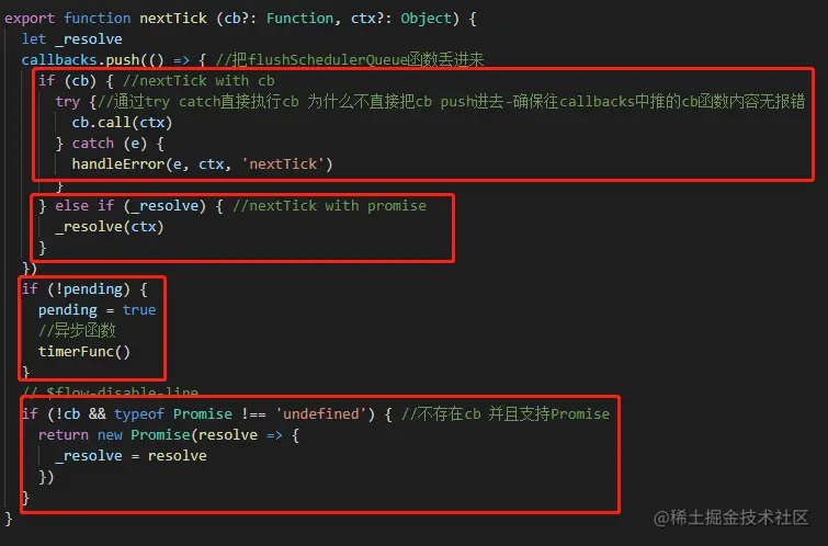 3.对于promise后再回调,首先往callbacks数组中丢入_resolve,_resolve是new Promise的resolve的赋值。初始pending为false首先设置为true并执行timeFunc。timeFunc根据浏览器支持方式做不通的调用,最终执行flushCallbacks。flushCallbacks首先把pending设为false,然后复制一份callbacks数组最终返回reslove然后执行.then的回调。