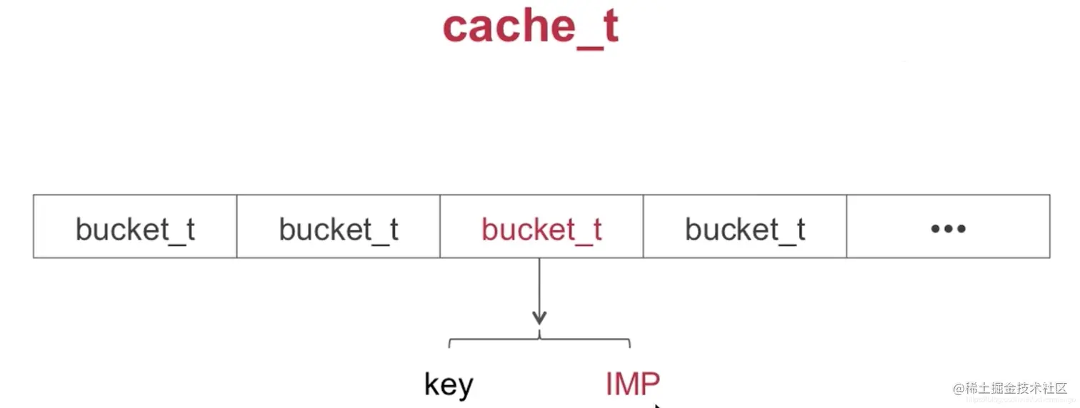 cache的核心是有一个类型为bucket_t的指针,它指向了一个以_key和IMP对应的缓存节点。key对应OC中的selector,在调用方法时是个选择器SEL。IMP理解为无类型的函数指针。