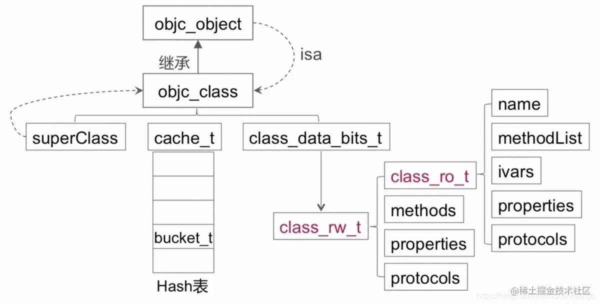 - class_data_bits_t bits:这是Class的核心,实际上是对class_rw_t的数据结构的封装。class_rw_t中包含了class_ro_t 类相关的只读信息、protocols 类分类中的协议、properties 类分类中的属性、methods 类分类中的方法。其中class_ro_t包含了name类名、methodList类的方法列表 --method_t、ivars声明的类的成员变量、类的属性、类的协议