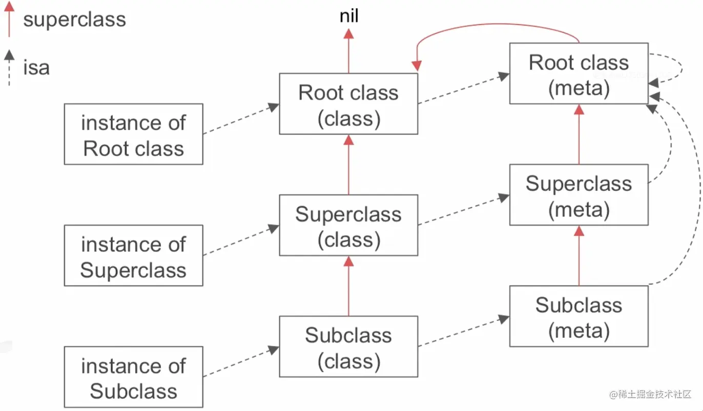 - NSObject Meta Class的 super class 指向 NSObject Class,和 Sark Class 不相等