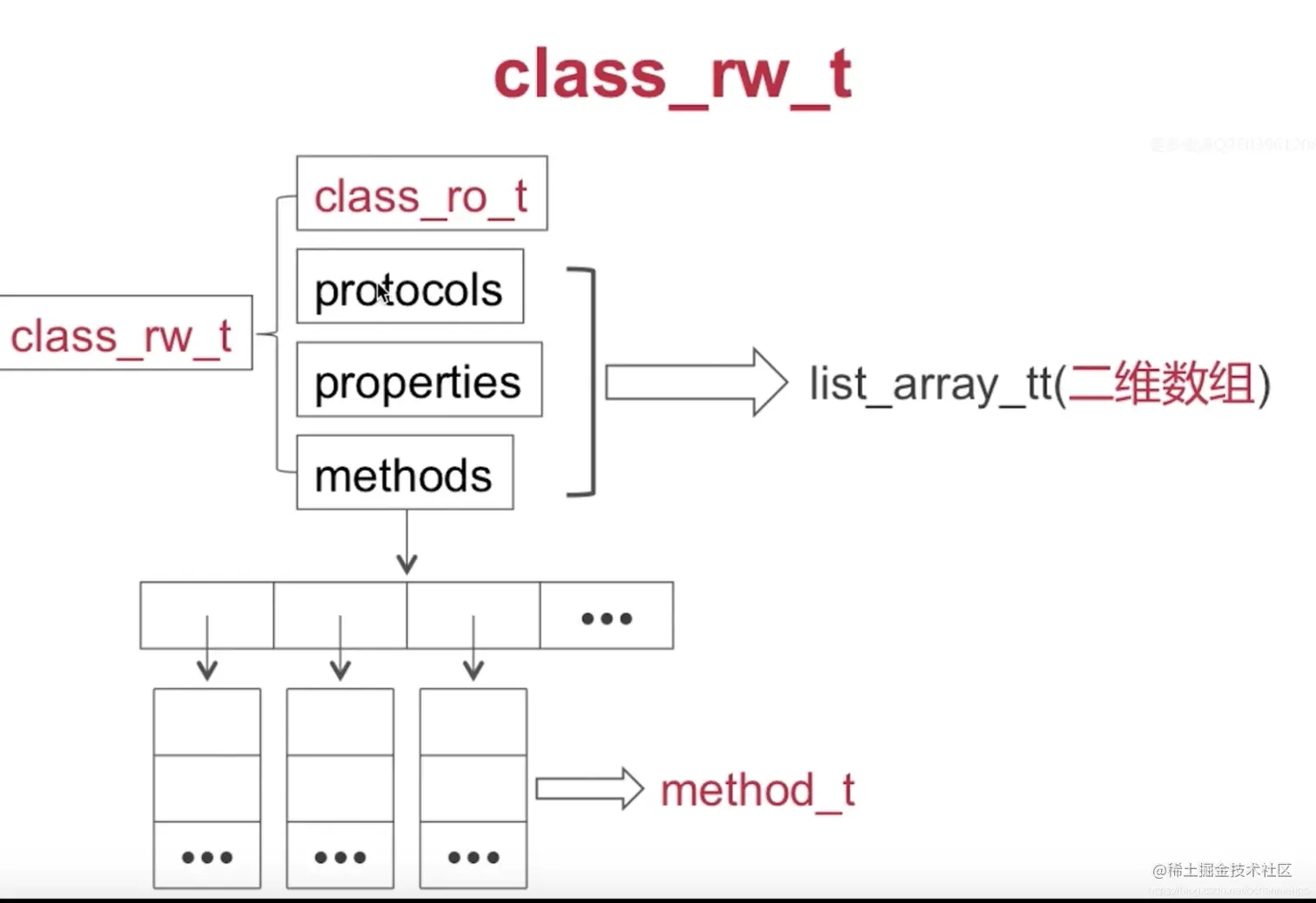 class_rw_t代表了类相关的读写信息,例如给类添加的分类的一些方法,属性以及协议等,同时它也对class_ro_t的封装,我们可以随时创建分类,为类增加属性或者方法