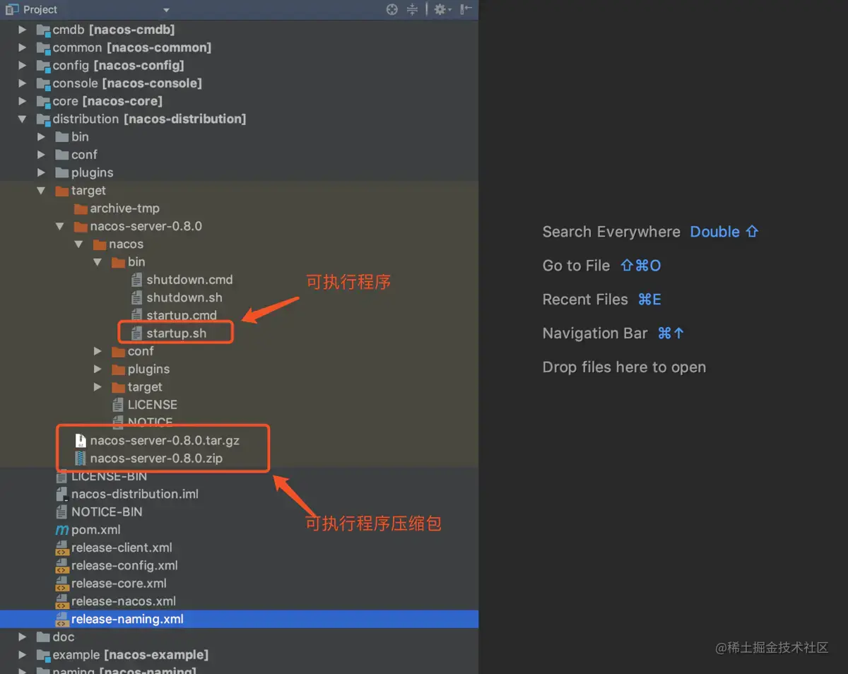 然后在项目的 distribution 目录下我们就可以找到可执行程序了,包括两个压缩包,这两个压缩包就是nacos 的 github 官网上发布的 Release 包。
