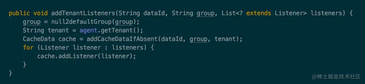 该方法分为两个部分,首先根据 dataId,group 和当前的场景获取一个 CacheData 对象,然后将当前要添加的 listener 对象添加到 CacheData 中去。