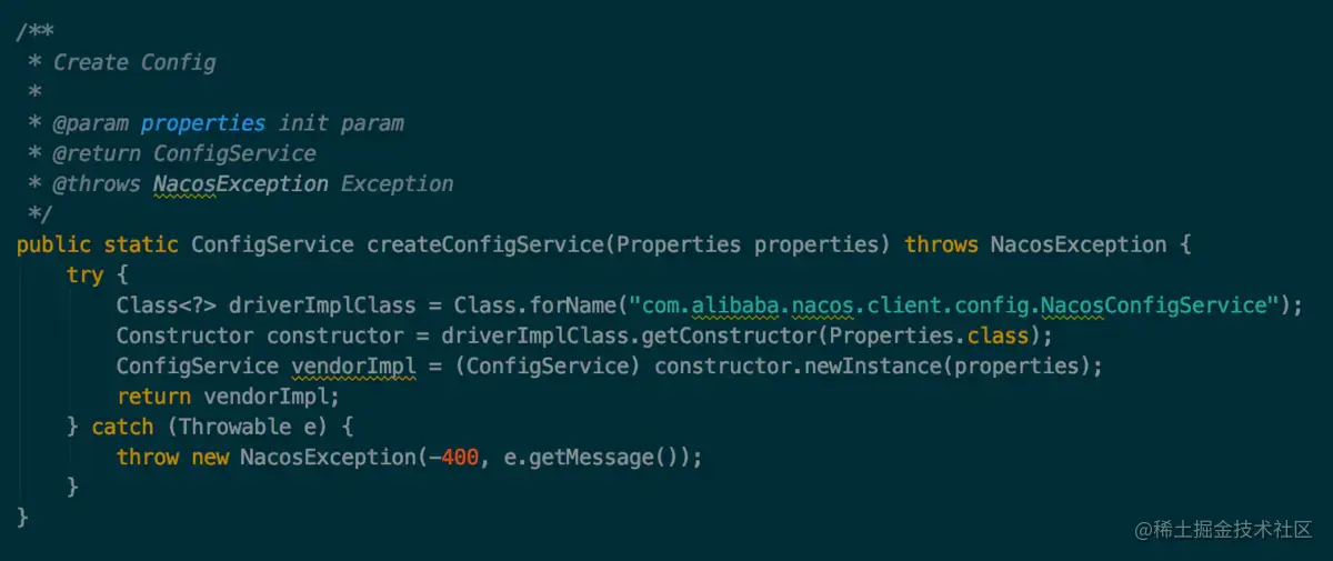 可以看到实际是通过反射调用了 NacosConfigService 的构造方法来创建 ConfigService 的,而且是有一个 Properties 参数的构造方法。