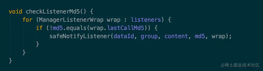 最后调用 CacheData 的 checkListenerMd5 方法,可以看到该方法在第一部分也被调用过,我们需要重点关注一下。