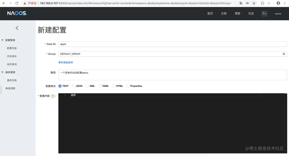 接下来我们在控制台上创建一个简单的配置项,如下图所示: