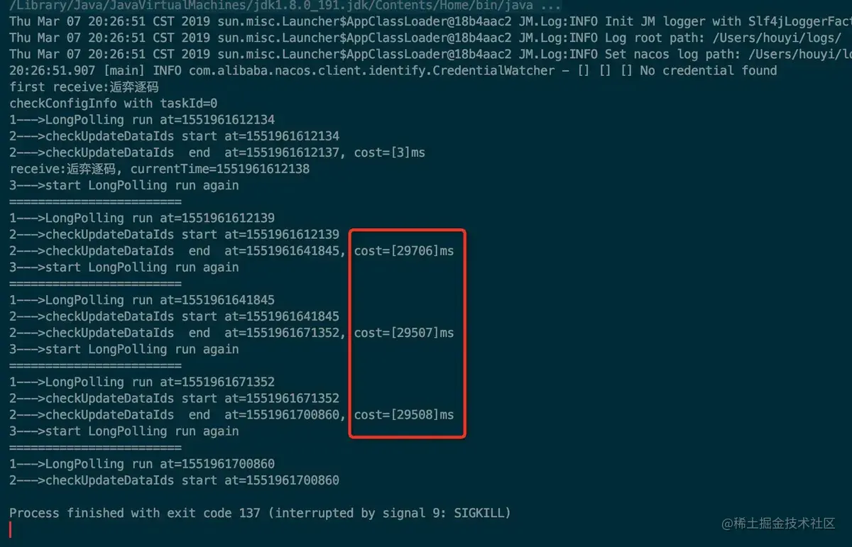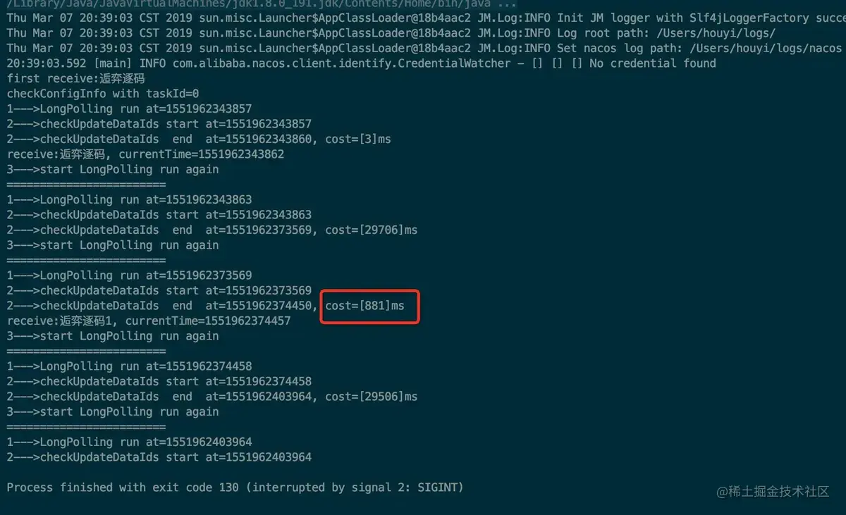 上图中红框中就是我在客户端一发起请求时就更新配置后打印的结果,从结果可以看出来该请求并没有等到 29.5s+ 才返回,而是一个很短的时间就返回了,具体多久需要从服务端的实现中查询答案。
