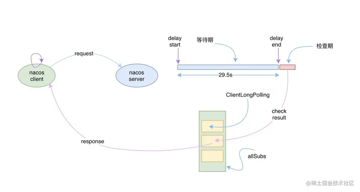- 1.Nacos 客户端会循环请求服务端变更的数据,并且超时时间设置为30s,当配置发生变化时,请求的响应会立即返回,否则会一直等到 29.5s+ 之后再返回响应