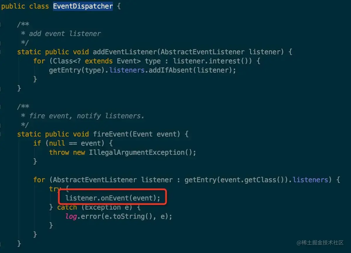 fireEvent 方法实际上是触发的 AbstractEventListener 的 onEvent 方法,而所有的 listener 是保存在一个叫 listeners 对象中的。