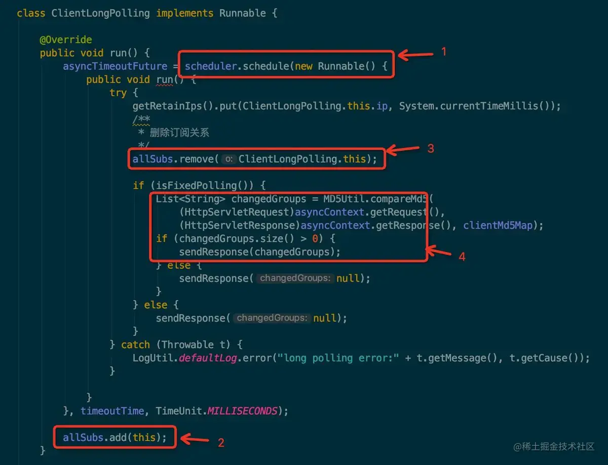 ClientLongPolling 被提交给 scheduler 执行之后,实际执行的内容可以拆分成以下四个步骤: