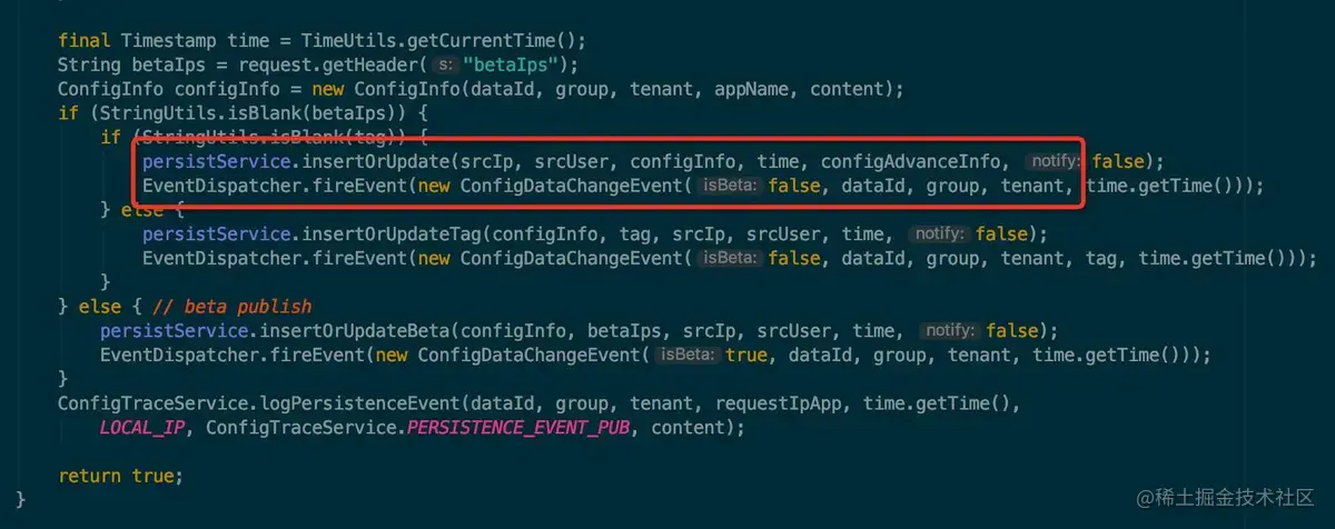 我只截取了重要的部分,从红框中的代码可以看出,修改配置后,服务端首先将配置的值进行了持久化层的更新,然后触发了一个 ConfigDataChangeEvent 的事件。