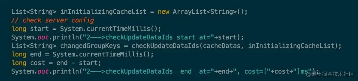 在 LongPollingRunnable 中的 checkUpdateDataIds 方法前后加上时间计算,然后将所消耗的时间打印出来,如下图所示: