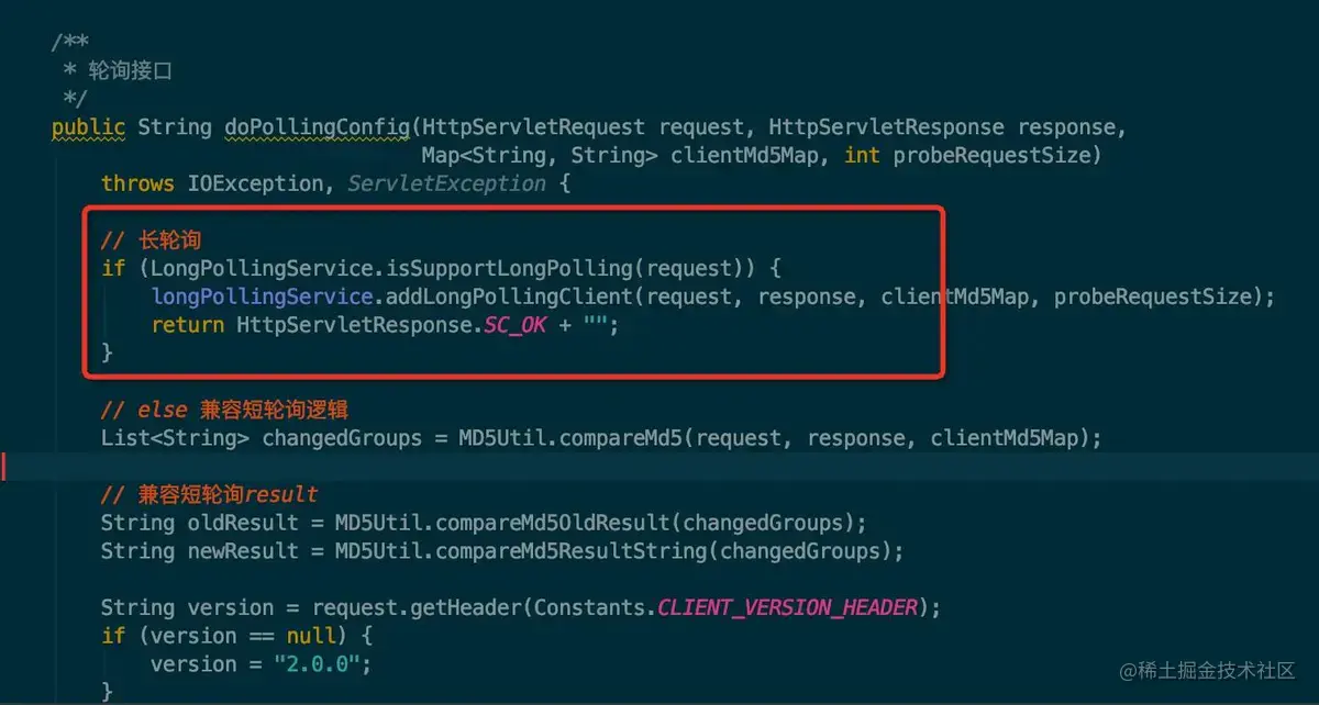 可以看到该方法是一个轮询的接口,除了支持长轮询外还支持短轮询的逻辑,这里我们只关心长轮询的部分,也就是图中红框中的部分。