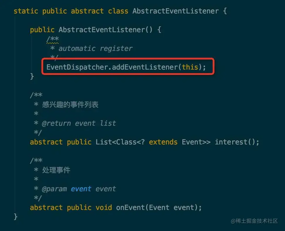 可以找到是在 AbstractEventListener 类的构造方法中,将自身注册进去了,如下图所示: