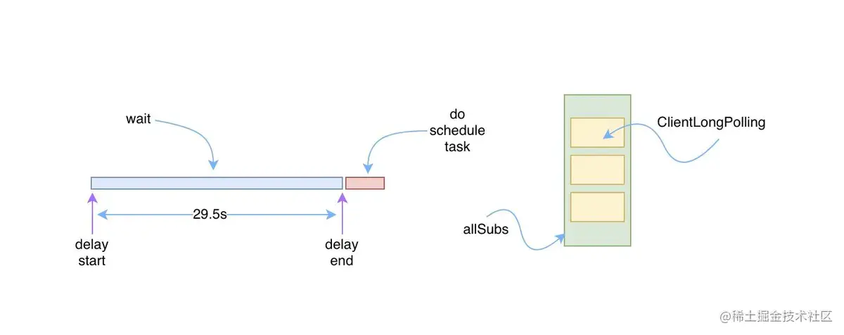 服务端直到调度任务的延时时间到了之前,ClientLongPolling 都不会有其他的任务可做,所以在这段时间内,该 allSubs 队列肯定有事情需要进行处理。