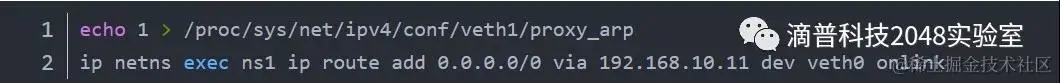 那ns1和ns2能不能相互ping通呢?行的,不过要先打开veth1的arp代答,并给ns1配个默认网关