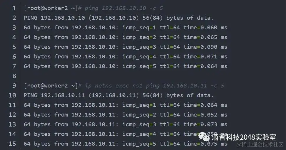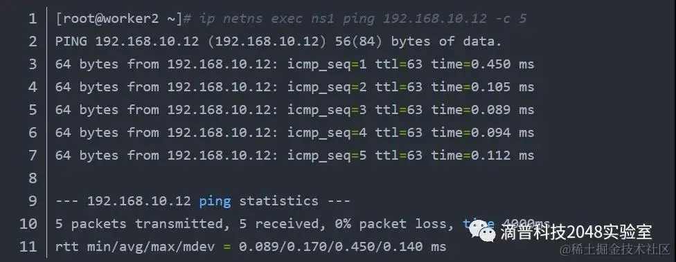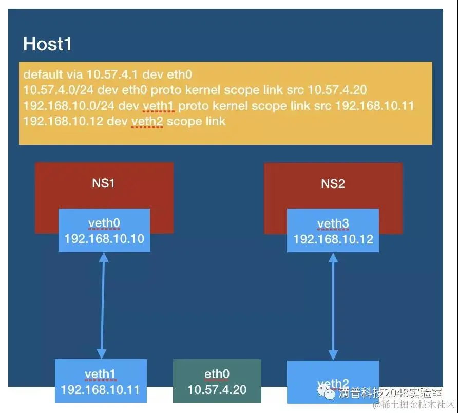 这条路由指示以后凡是往192.168.10.0/24这个网段的地址都给veth1,这显然不是我们想要的结果,因为其它的ns并没有连在veth1上。在k8s的节点上,相同主机的pod通常会在同一个子网段里,前面那条路由就相当于把这个主机的全部pod的通信都引到了veth1上,这就有问题了。其实,我们是可以不在veth1上配置IP的,上面的示例只是为了让大家可以对veth连接的效果有个认识,因为veth1连的是主机的内核协议栈,主机上已经有很多个IP了,只是因为当前ns1中没有默认路由,去主机的IP的话是不通的(当然如果你的主机的网段本来就是192.168.10.0/24网段,那又是能通的),所以如果不配置veth1端的IP的话,只要加上默认路由就可以了,下面我们演示一个更实用的场景。