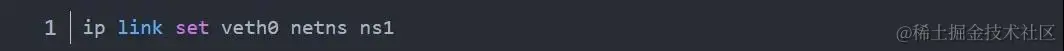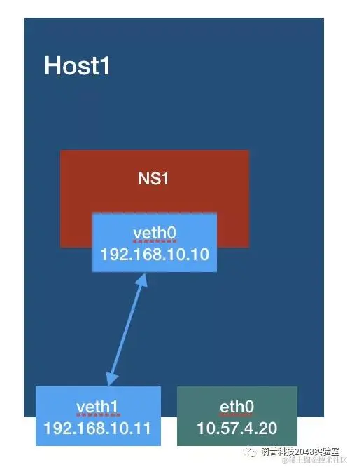 然后把刚创建的veth1网卡的其中一端转到ns1,这就好像一端插到ns1上,另一端插在主机的ns上: