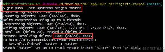 按照提示,再次执行:git push --set-upstream origin master,成功:
