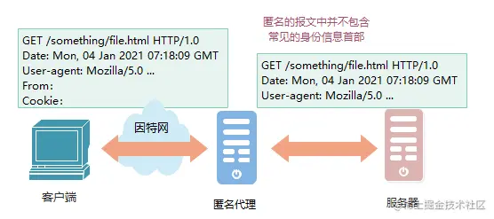 匿名者代理会主动从HTTP报文中删除身份特性(比如客户端IP地址、From首部、Referer首部、cookie、URI的session ID等),提高高度的私密性和匿名性。