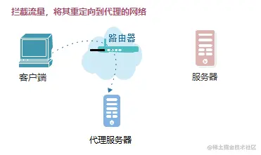 网络基础层设施通过若干技术手段,在客户端不知道或没有参与的情况下,拦截网络流量并将其导入代理。
