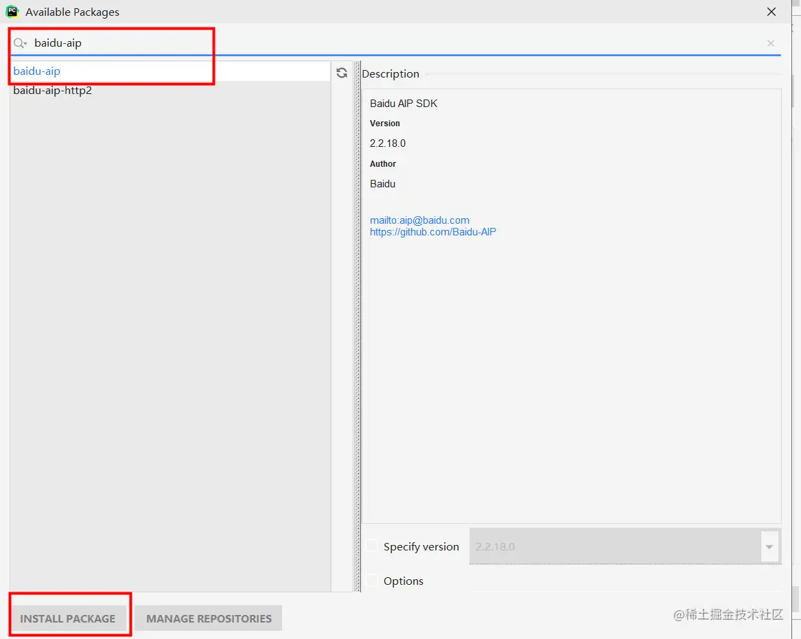 搜索输入:baidu-aip,点击搜索结果列表中第一个,点击install package
