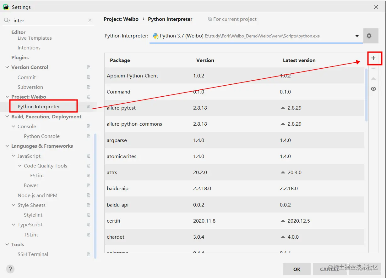 打开Setting→Python Interpreter,点击+号