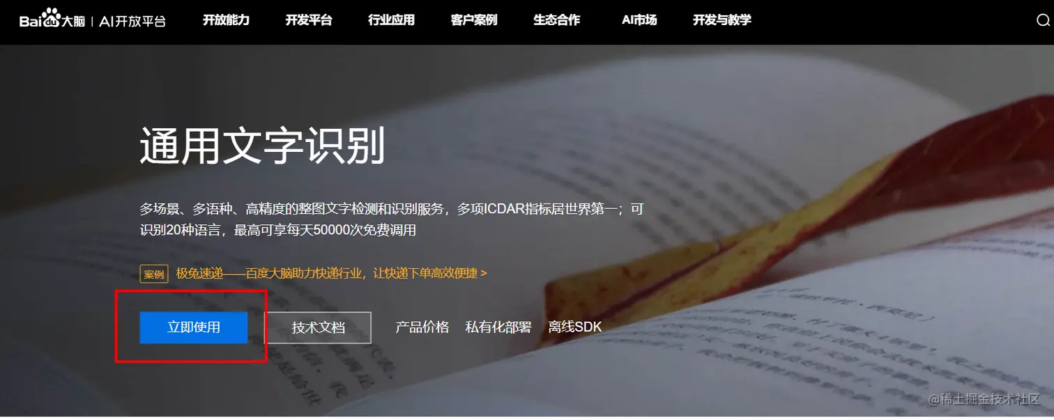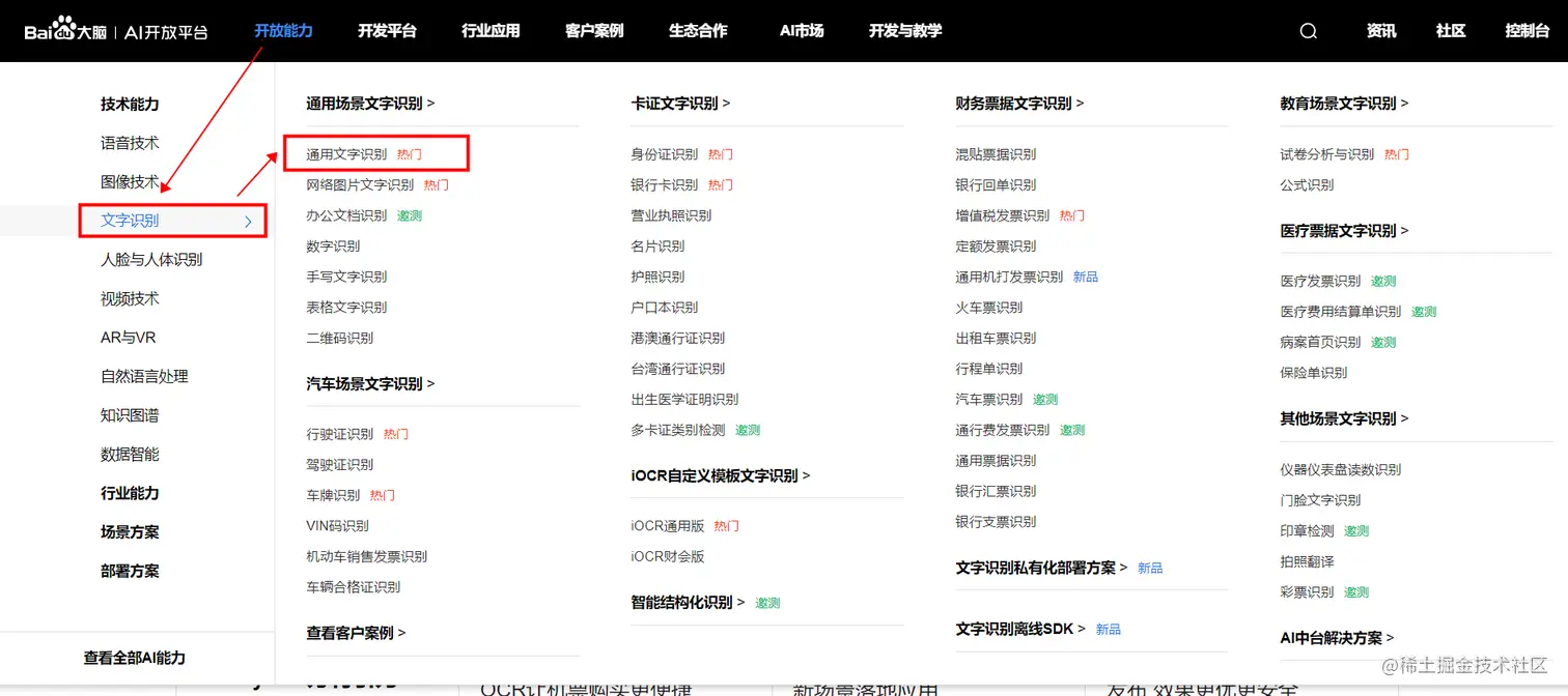 进入开放能力→文字识别→通用文字识别,如下图: