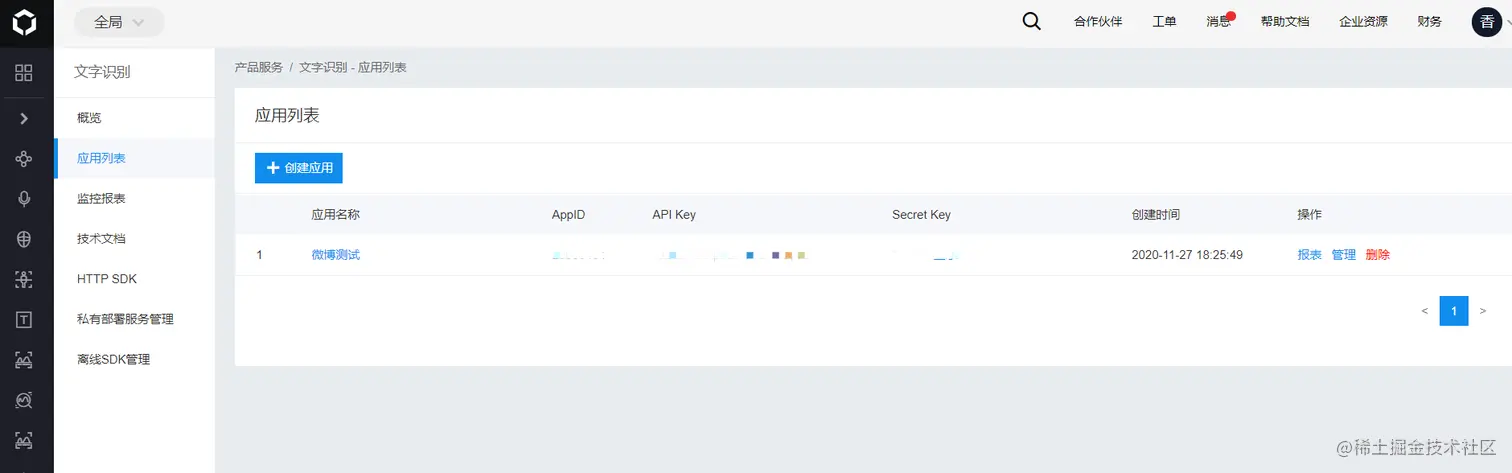 创建成功后进入管理应用,能查看创建的应用AppID、API Key、Secret Key,如下图: