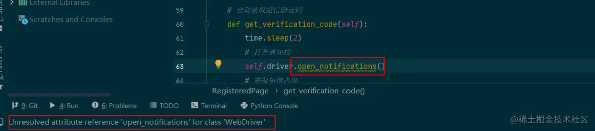 注意:由于我的类中继承了BasePage类,而BasePage类中声明driver是属于WebDriver库(WebDriver库属于Selenium框架),而以上代码中调用的open_notifications()和press_keycode()方法是属于webdriver库(webdriver库属于appium框架),所以需要在该类中导入webdriver类,并在类中将driver声明为webdriver,否则会出现如下图所示错误: