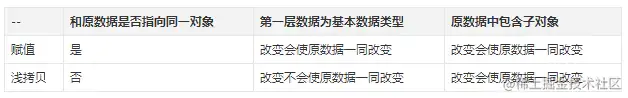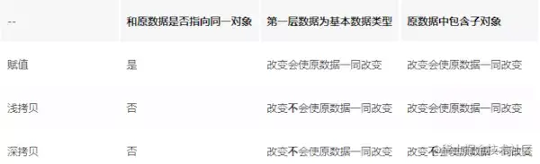 - 浅拷贝和深拷贝都只针对于引用数据类型,浅拷贝只复制指向某个对象的指针,而不复制对象本身,新旧对象还是共享同一块内存;但深拷贝会另外创造一个一模一样的对象,新对象跟原对象不共享内存,修改新对象不会改到原对象;