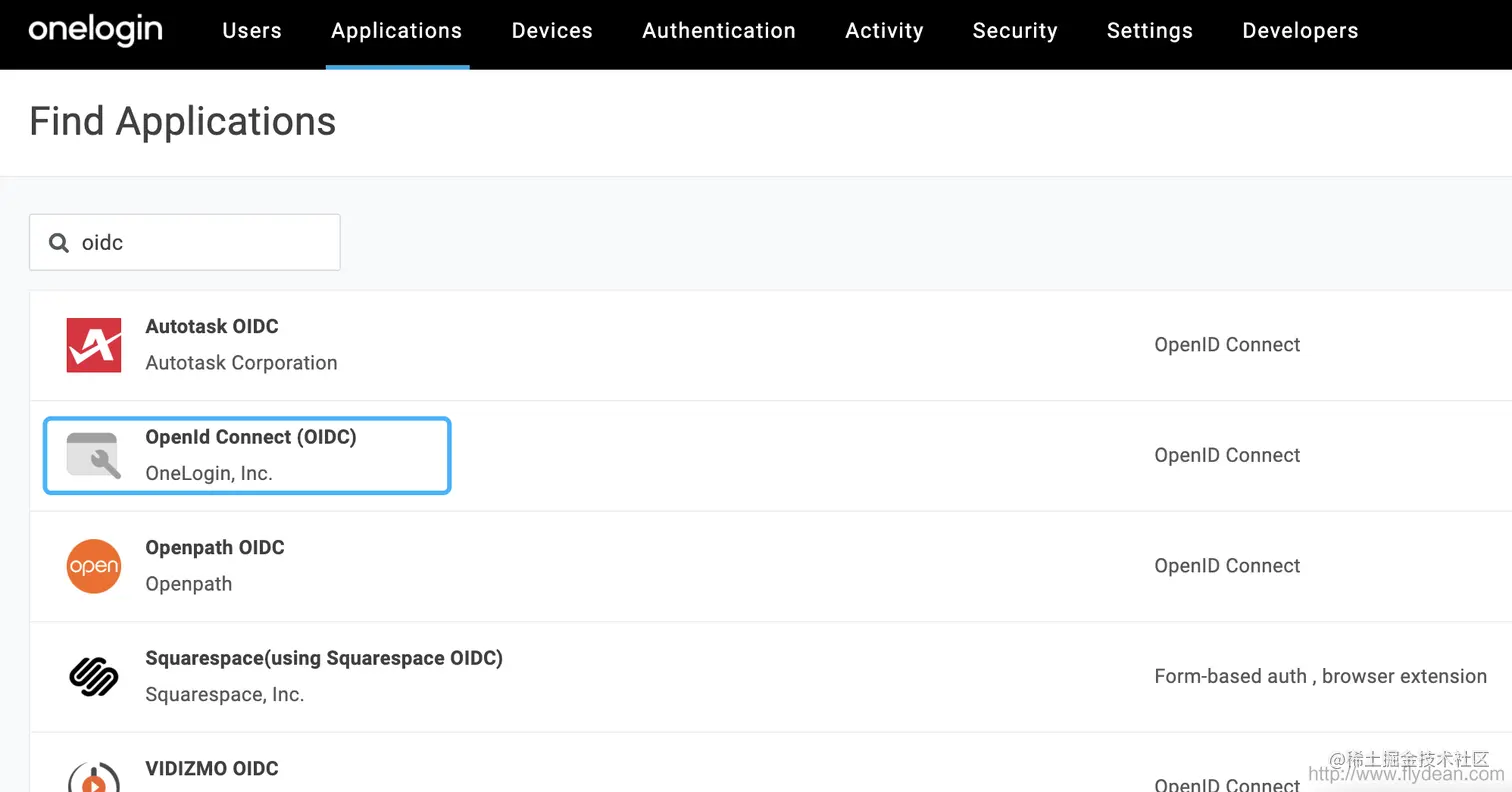 在applications tab,我们要使用openid connect,那么就搜索oidc: