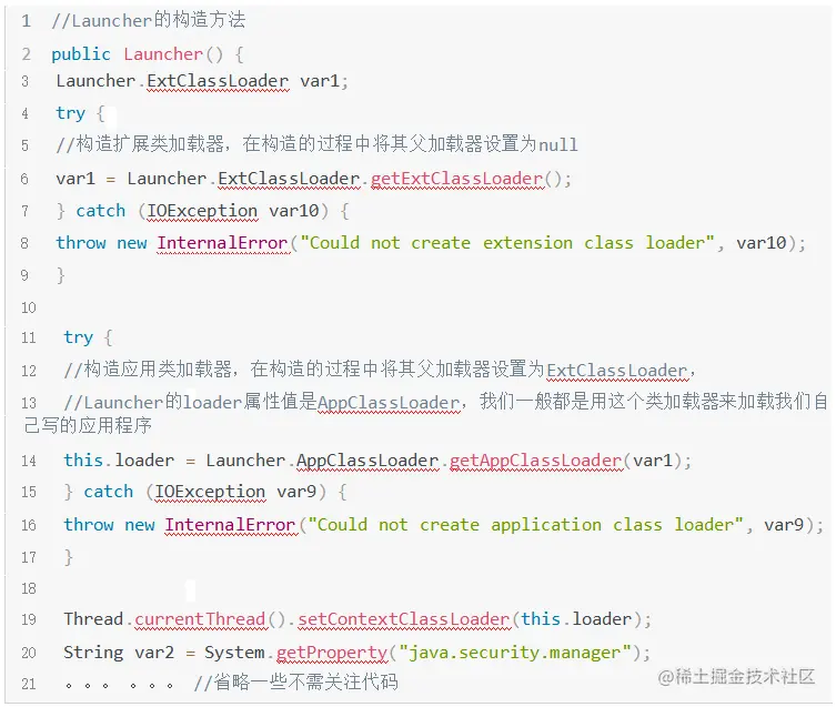 在Launcher构造方法内部,其创建了两个类加载器,分别是sun.misc.Launcher.ExtClassLoader(扩展类加载器)和sun.misc.Launcher.AppClassLoader(应用类加载器)。
