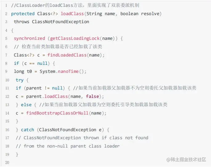 我们来看下应用程序类加载器AppClassLoader加载类的双亲委派机制源码,AppClassLoader 的loadClass方法最终会调用其父类ClassLoader的loadClass方法,该方法的大体逻辑如下: