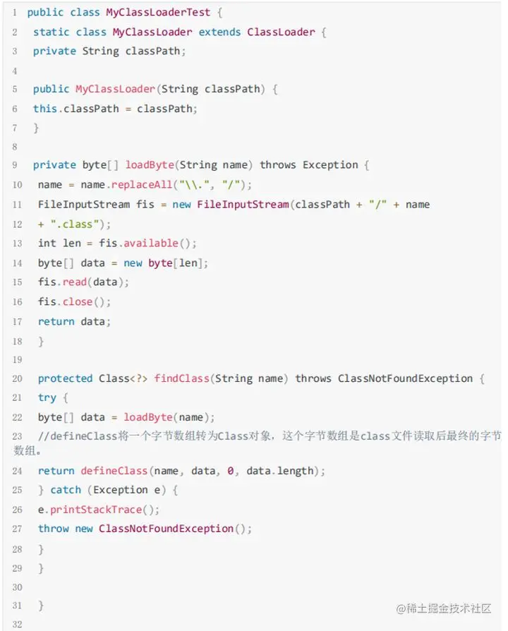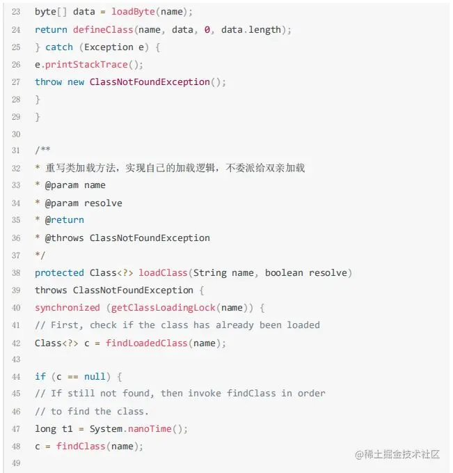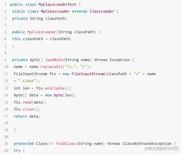 自定义类加载器只需要继承 java.lang.ClassLoader 类,该类有两个核心方法,一个是loadClass(String, boolean),实现了双亲委派机制,还有一个方法是findClass,默认实现是空方法,所以我们自定义类加载器主要是重写findClass方法。