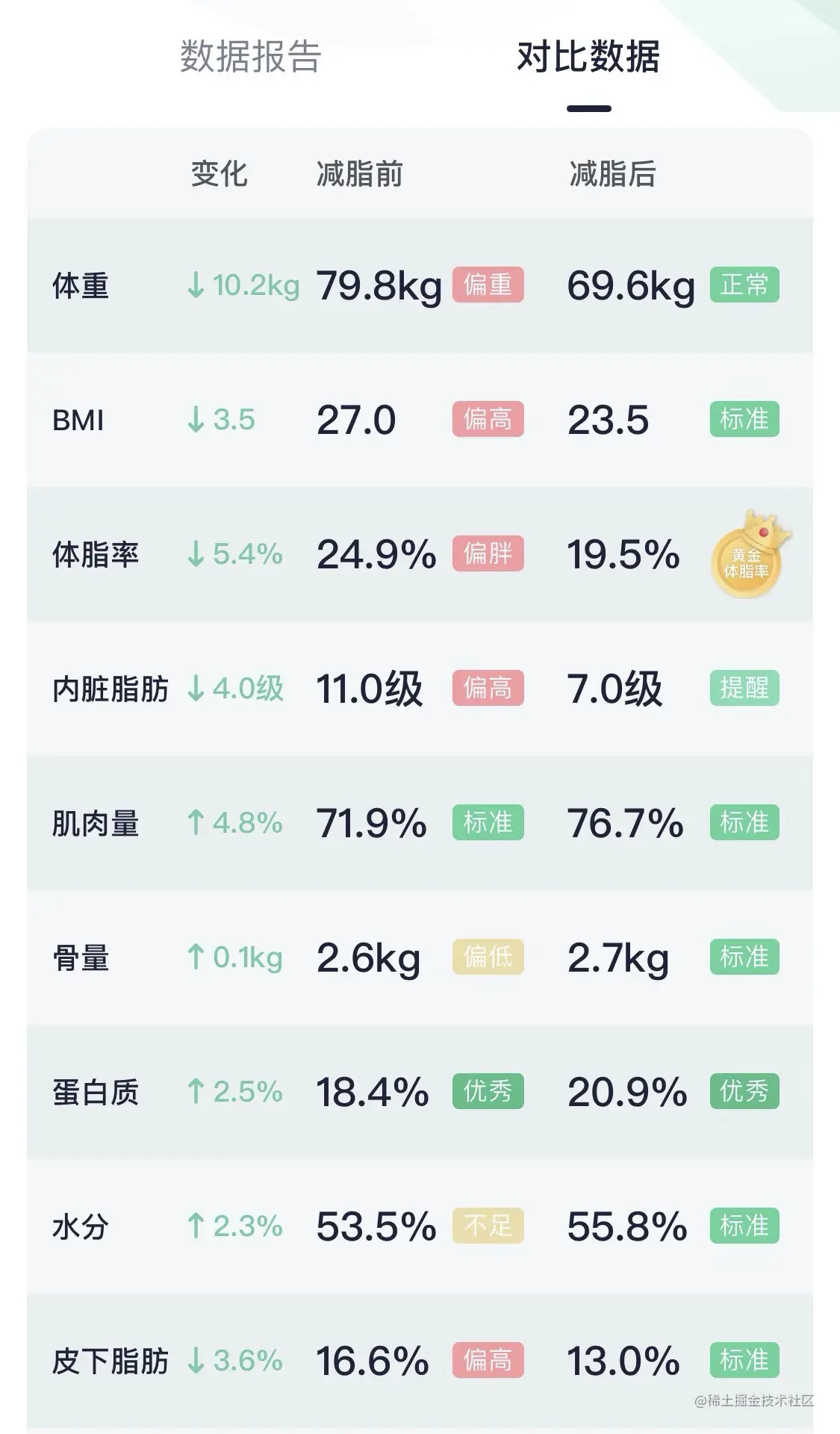 由于长期不注重饮食以及睡眠的原因,早就已经超出了我这个身高该有的体重了。于是我制定了3个月减肥30斤的计划,从160斤瘦到130斤,现在虽然没达到目标只瘦了20斤,但是效果还是很可以的。无论是从看上去,还是从数据上都非常不错。