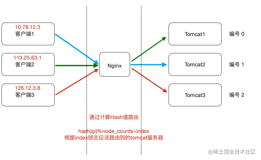 针对key进⾏hash处理hash(key1)%3=index, 使用余数index锁定存储的具体服务器节点