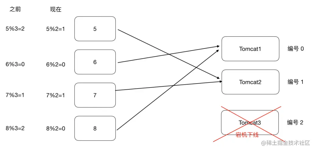 服务器数量由3个变为了2个,之前所有的求模都需要重新计算。