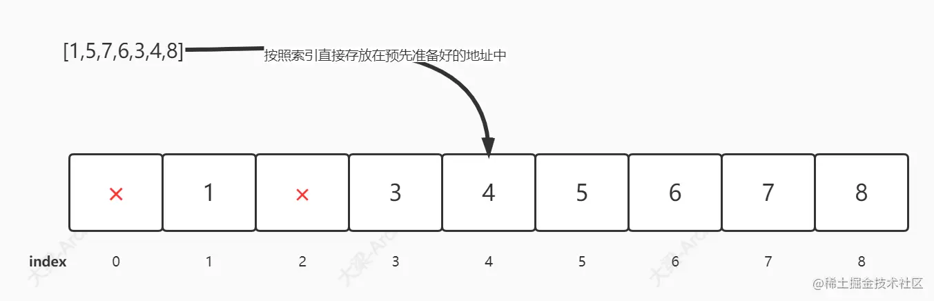 缺点: 浪费空间(如 [1,2,3,1,1,1,1,99] 中如果都开辟就浪费了将近96个空间)