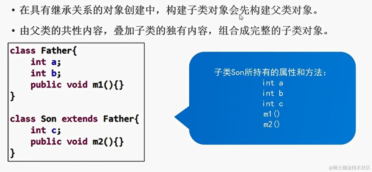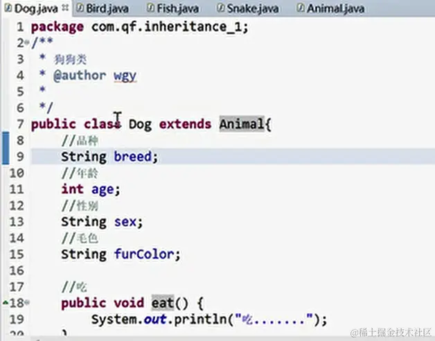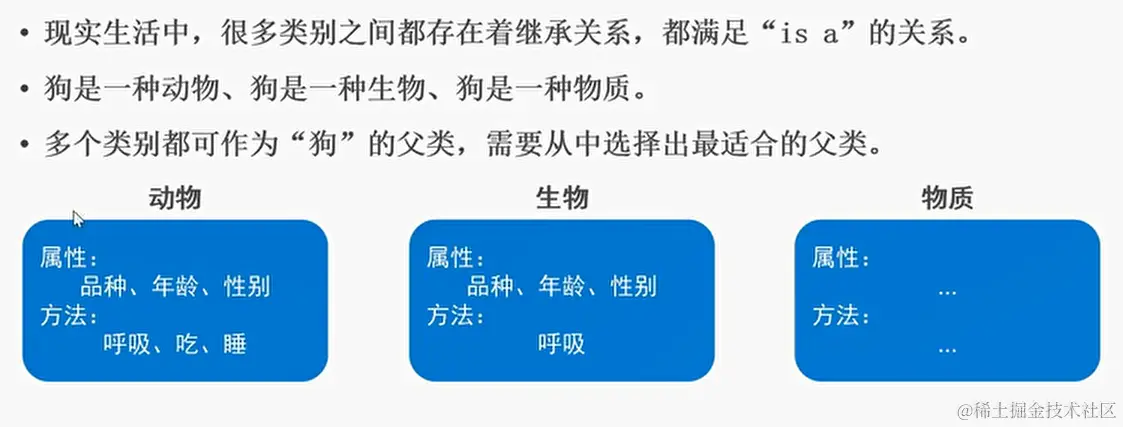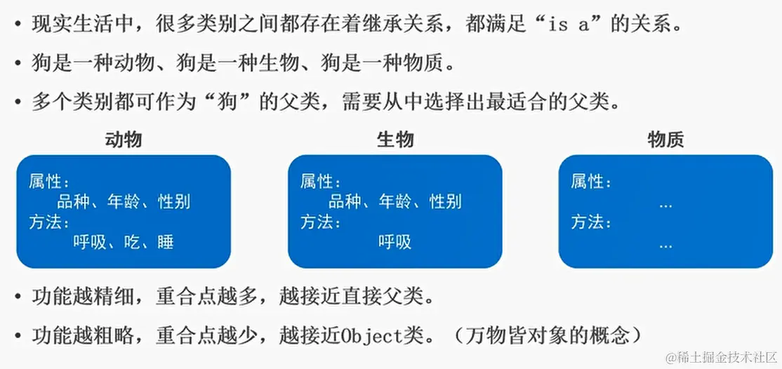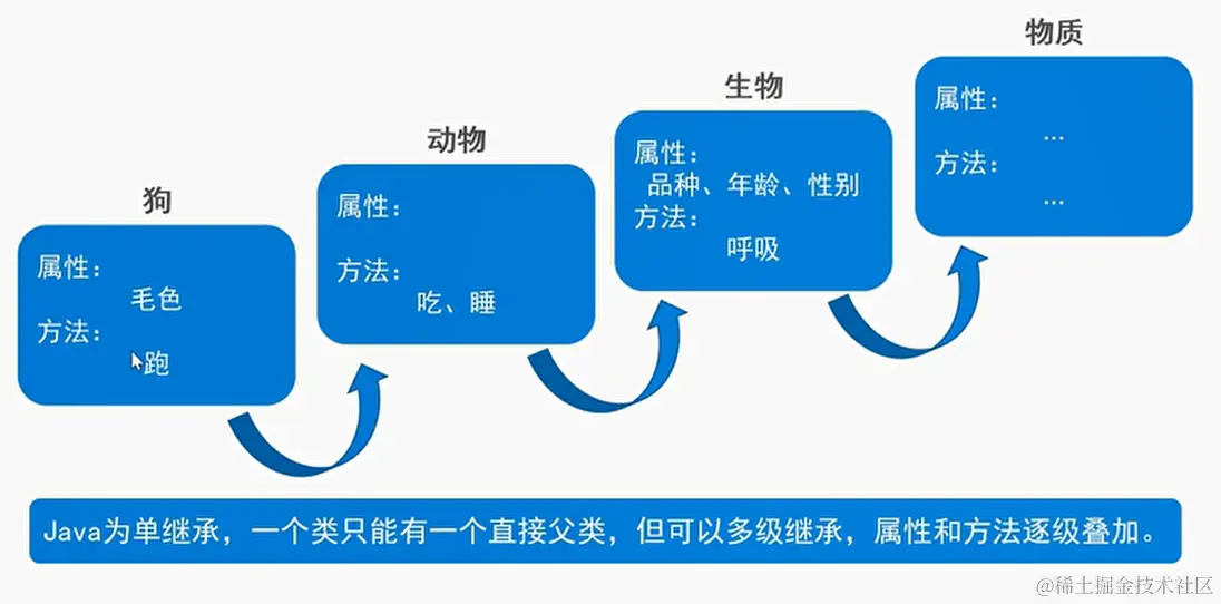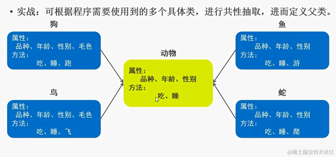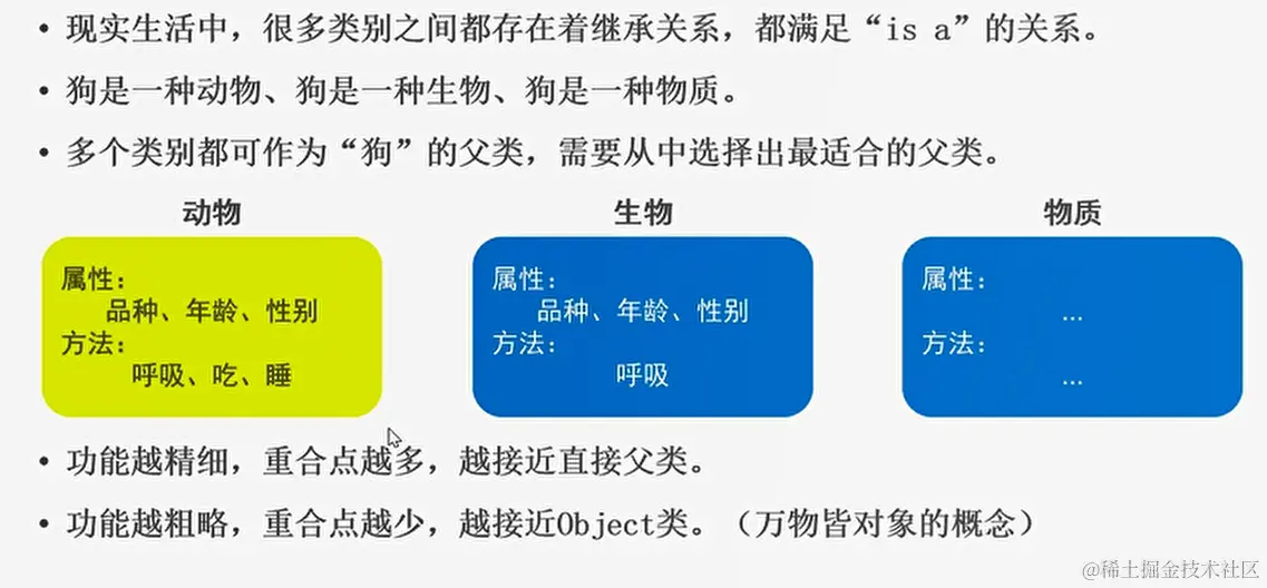 148 继承 ifubing 2021-01-05 50 阅读1分钟 生活中的继承 程序中的继承 父类的选择 选择一个最接近的作为父类 父类的抽象 演练 定义狗的类 狗的类继承动物类 继承 继承的特点 不可继承 访问修饰符 方法的覆盖 super关键字 super访问方法 super访问属性 继承中的对象创建 继承后的对象构建过程 super调用父类的构造方法 super调用父类的带参构造方法 this与super