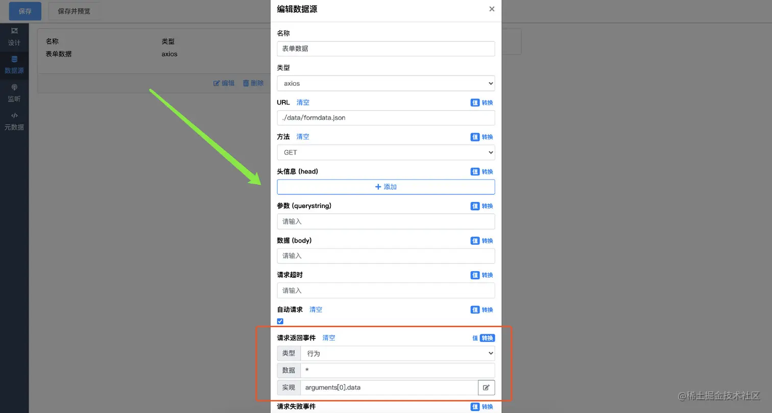 其中 model 是表单内部数据,可用于关联组件输入输出交互的数据,转换类型是 行为 时,数据 属性值就是要更新 model 里的属性,实现 里的 arguments 代表该事件触发后传递的参数数组,这里第一个参数是 axios 发起请求后返回的 response 对象,其中 data 就是请求结果的数据