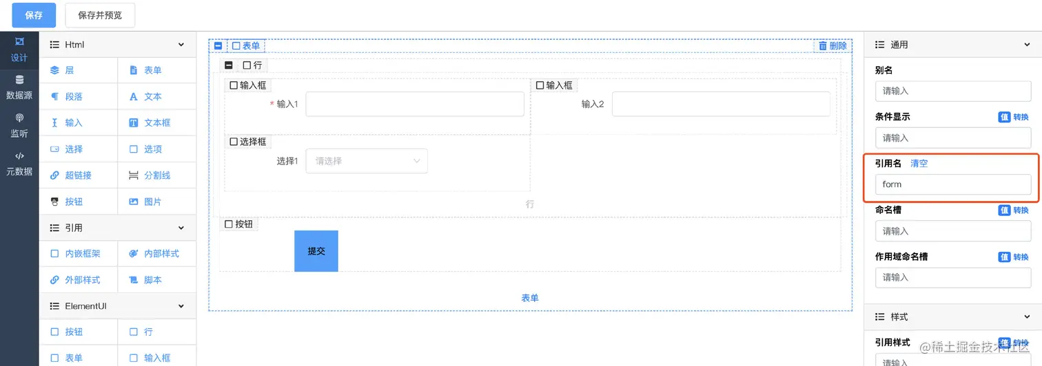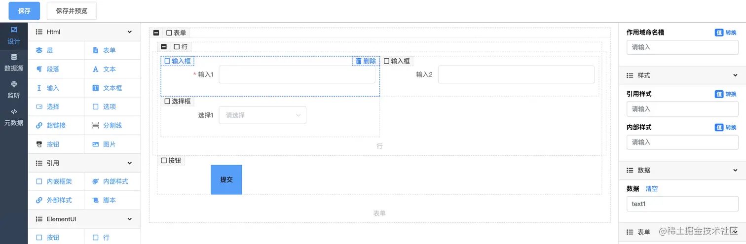 设计器通过配置实现了组件支持和属性编辑,并可保存布局和打开预览页,在这篇文章里实现了 elementui 表单组件的简化配置,这里直接拿来用
