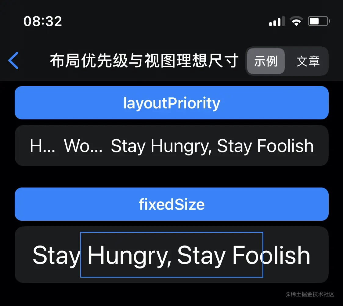 在不打开注释处的代码时,最后的 Text 文字是会被压缩显示成省略号的。系统默认所有 View 的 layoutPriority 都是 0。如果我们将注释打开,赋予最后的 Text 较高的优先级,那么最后的 Text 就可以完全展示出来,而前面的两个 Text 可能会因为空间不足而被压缩。
