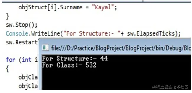 Console.WriteLine("For Structure:- " + sw.ElapsedTicks);