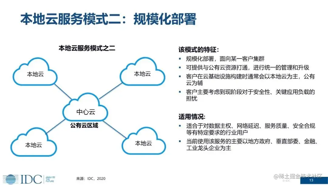**规模化部署是本地云服务模式的另一代表,**该种模式主要面向某一客户集群,通过与公有云资源打通进行统一的管理和升级,用户在基础设施构建时通常会以本地云为主,公有云为辅,适合于对数据主权、网络延迟、服务质量、安全合规等有特定要求的行业用户。当前使用该服务的主要以地方政府、垂直部委、金融、工业龙头企业为主。在这一模式下,浪潮云成为典型服务商代表被IDC体现在报告中,并认为在本地云服务领域已具备一定的先发优势。