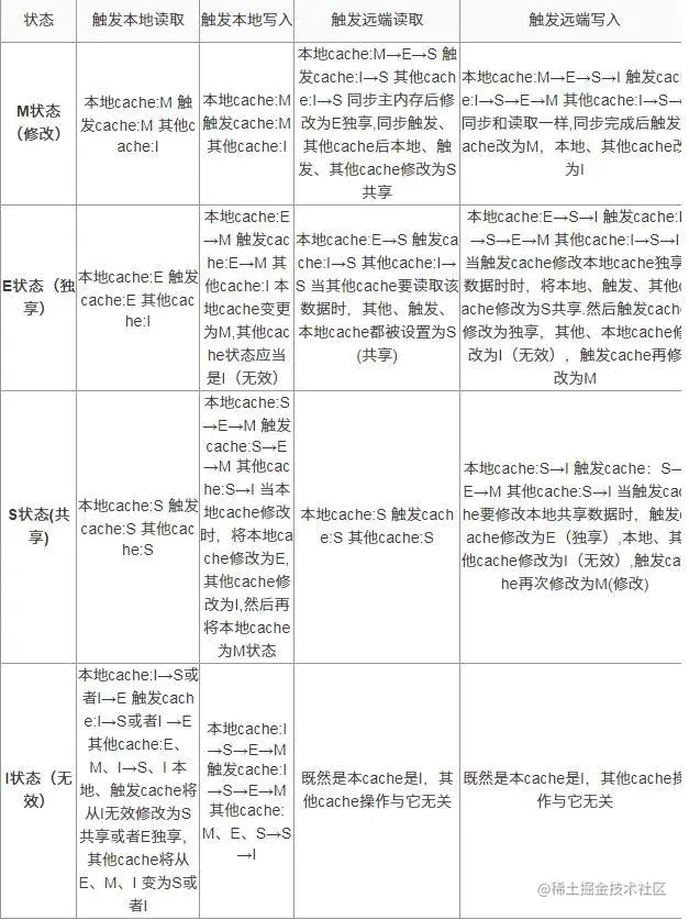 对于M和E状态而言总是精确的,他们在和该缓存行的真正状态是一致的,而S状态可能是非一致的。如果一个缓存将处于S状态的缓存行作废了,而另一个缓存实际上可能已经独享了该缓存行,但是该缓存却不会将该缓存行升迁为E状态,这是因为其它缓存不会广播他们作废掉该缓存行的通知,同样由于缓存并没有保存该缓存行的copy的数量,因此(即使有这种通知)也没有办法确定自己是否已经独享了该缓存行。