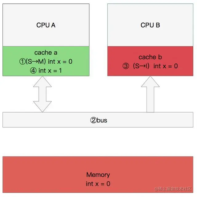 CPU A 将x设置为M状态(修改)并通知缓存了x的CPU B, CPU B将本地cache b中的x设置为I状态(无效)