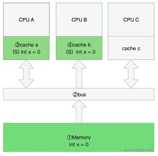 假设有三个CPU A、B、C,对应三个缓存分别是cache a、b、 c。在主内存中定义了x的引用值为0。