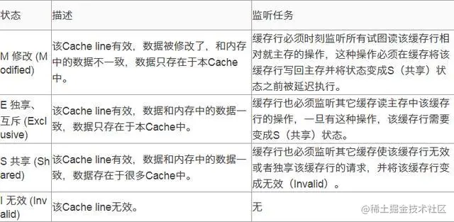 MESI 是指4中状态的首字母。每个Cache line有4个状态,可用2个bit表示,它们分别是: