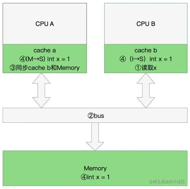 CPU A同步CPU B的x,将cache a和同步后cache b中的x设置为S状态(共享)。
